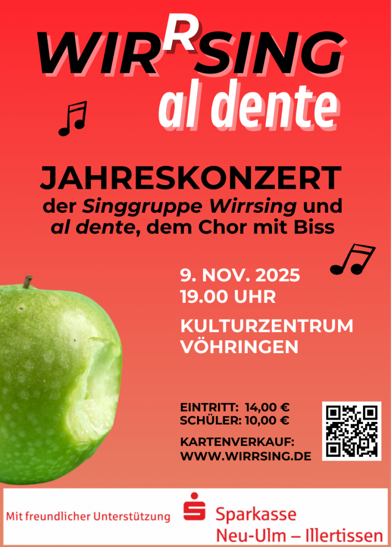 Unser Jahreskonzert findet am Sonntag, 9. November, im Kulturzentrum Vöhringen statt, zu dem wir Sie herzlich einladen. Besonders freuen wir uns, dass an diesem Abend das Ensemble “al dente” mit uns das abwechslungsreiche Programm gestalten wird. Beginn ist 19.00 Uhr, Einlass ab 18.30 Uhr. Karten können Sie hier ganz einfach per Klick bestellen oder über die Chormitglieder erwerben, alternativ in der Geschäftsstelle der VHS Illertissen oder an der Abendkasse. Wir würden uns sehr über Ihren Besuch und den gemeinsamen musikalischen Abend freuen.